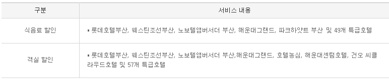공항, 호텔 무료 발렛파킹 서비스 외에도 특급호텔 식음료 및 객실 할인서비스 등이 함께 제공된다. 다만, 특급 호텔의 경우 부산은행 법인카드이다 보니, 주로 부산 인근에 위치한 호텔에서 사용할 수 있는 경우가 많다.