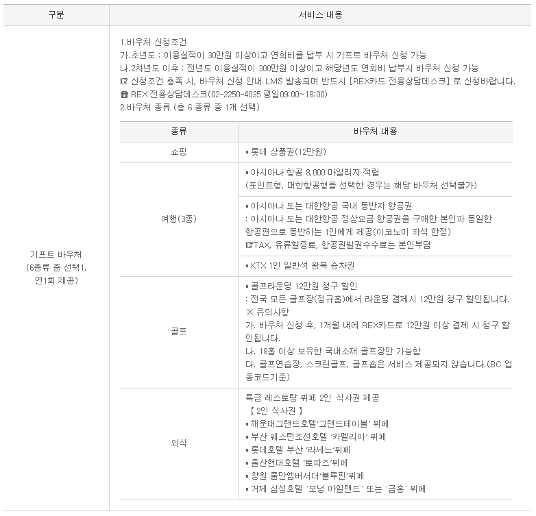 위에서 REX 법인카드의 연회비 15만원이 결코 비싸지 않은 두 가지 이유 중 하나가 REX 법인카드의 바우처 제공 서비스 혜택이다. 개인 신용카드에서나 주어지는 바우처 서비스가 제공되는 법인카드인 셈이다. 롯데 상품권 12만원이나 아시아나항공 8,000마일리지 적립(포인트형과 대한항공형 카드의 경우 선택 불가), 대한항공 또는 아시아나항공 동반자 항공권, KTX 1인 일반석 왕복 승차권, 골프라운딩 12만원 청구 할인, 부산은행 본점이 위치한 부산 인근의 특급 레스토랑 뷔폐 2인 식사권 등이 바우처로 제공되며, 바우처 중에서 1개를 선택할 수 있다.