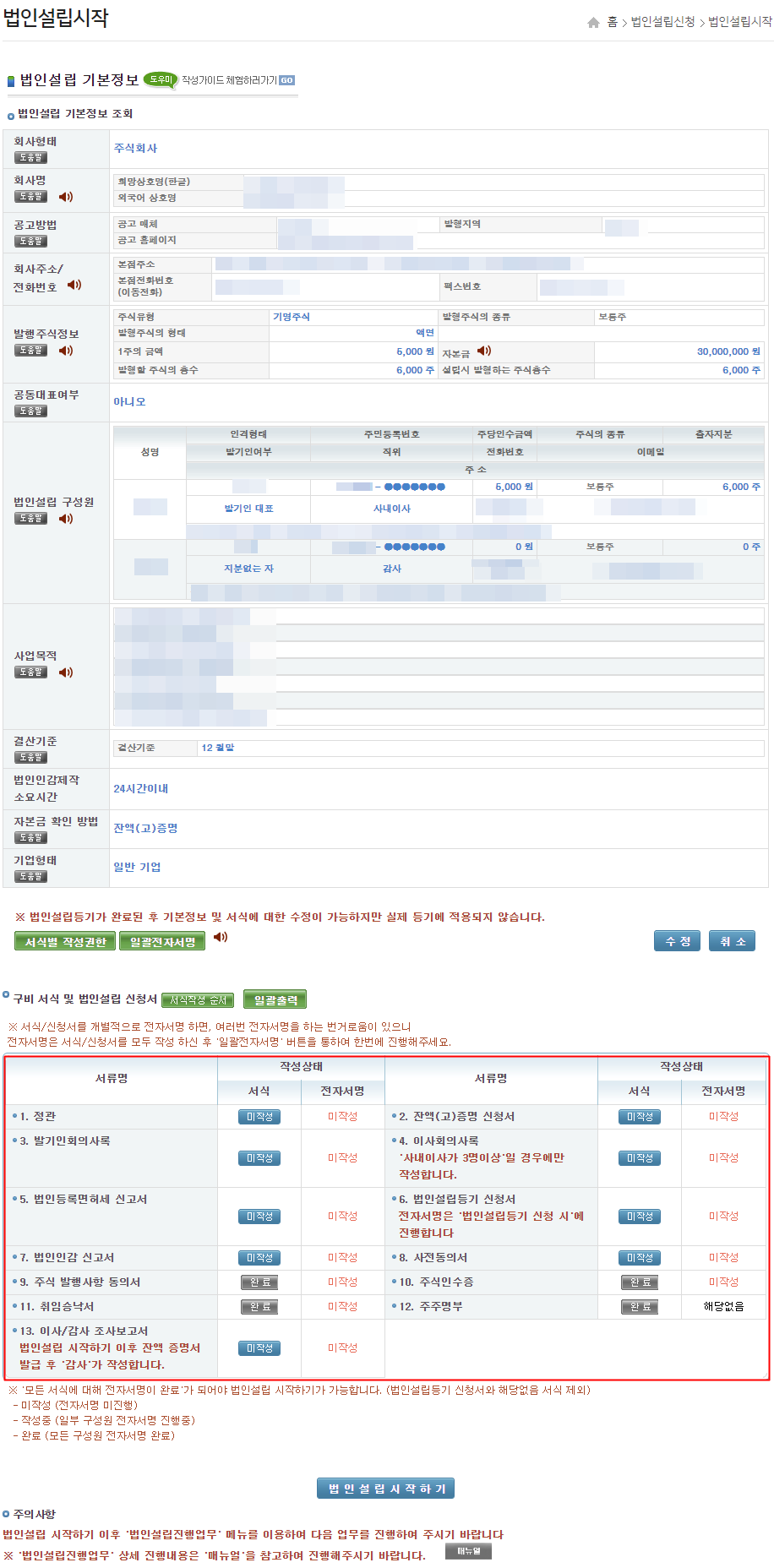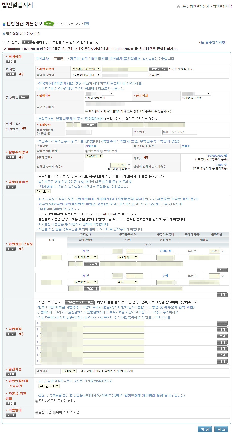 이제 법인설립시작에서 인터넷등기소에서 검색한 희망상호명과 외국어 상호명, 공고방법(신문, 인터넷 등) 등을 선택한다. 회사주소와 발행주식정보, 공동대표 여부 등도 선택한다. 법인 설립 구성원도 입력해야 하며, 최소한 발기인 대표인 대표이사(사내이사) 1인과 감사 1인이 필수적으로 필요하다. 사업목적, 결산기준월, 법인인감 제작 소요시간, 자본금 확인방법, 기업 형태 등에 대해서도 입력한다.
