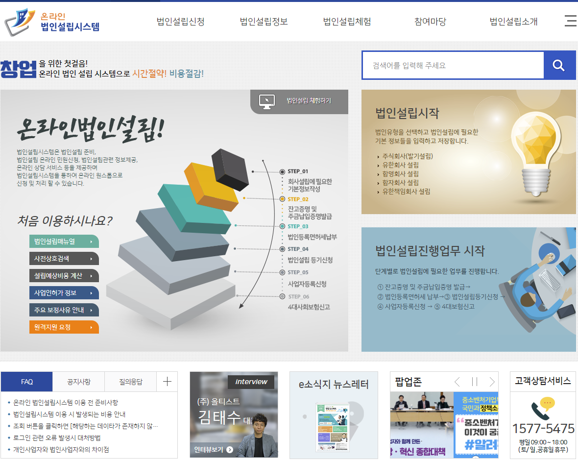 중소벤처기업부 온라인법인설립시스템 - 법인설립서비스, 매뉴얼, 체험 서비스, 민원 신청, 상담 서비스 제공