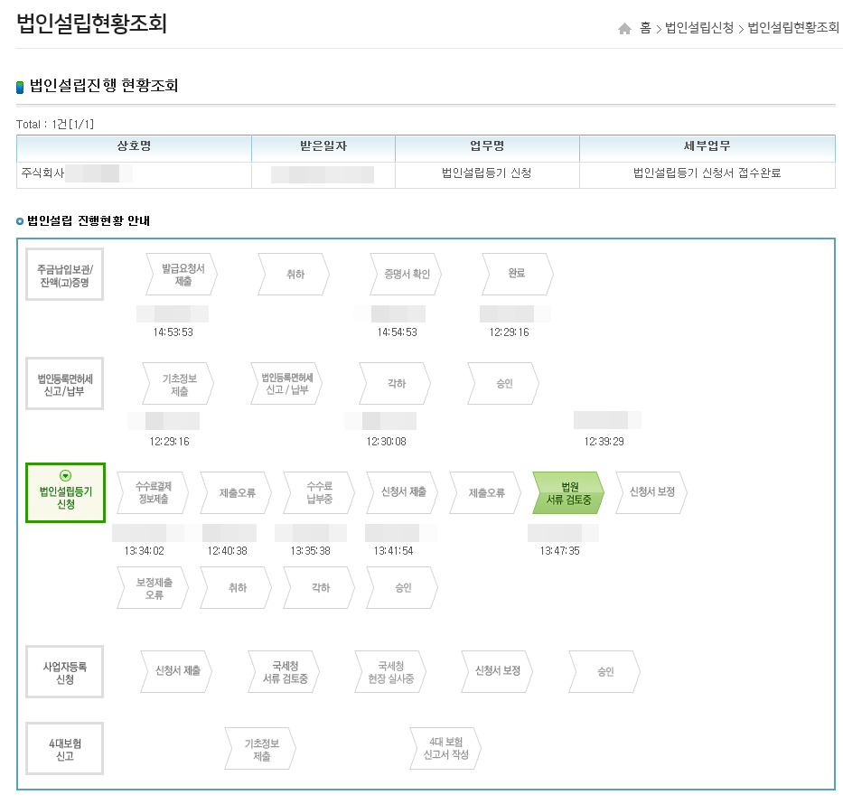 법인설립등기신청수수료까지 납부하면 온라인 법인설립시스템에서 작성된 법인설립등기 신청서를 대법원 인터넷등기소에서 법인설립 등기를 진행하게 된다. 신청 내용 중 수정해야 할 경우가 발생할 경우, 인터넷등기서에서 해당 신청서에 대한 보정을 요청하게 되며, 보정 요청 시 관련 내용을 수정해 다시 법인설립등기 신청서를 제출하면 된다. 일반적으로 신청서 보정은 사업목적과 관련한 업종 선정과 관련한 내용이 많으므로 사전에 한국표준산업분류표 상 업종 내용을 정확히 기재해 둘 필요가 있다.