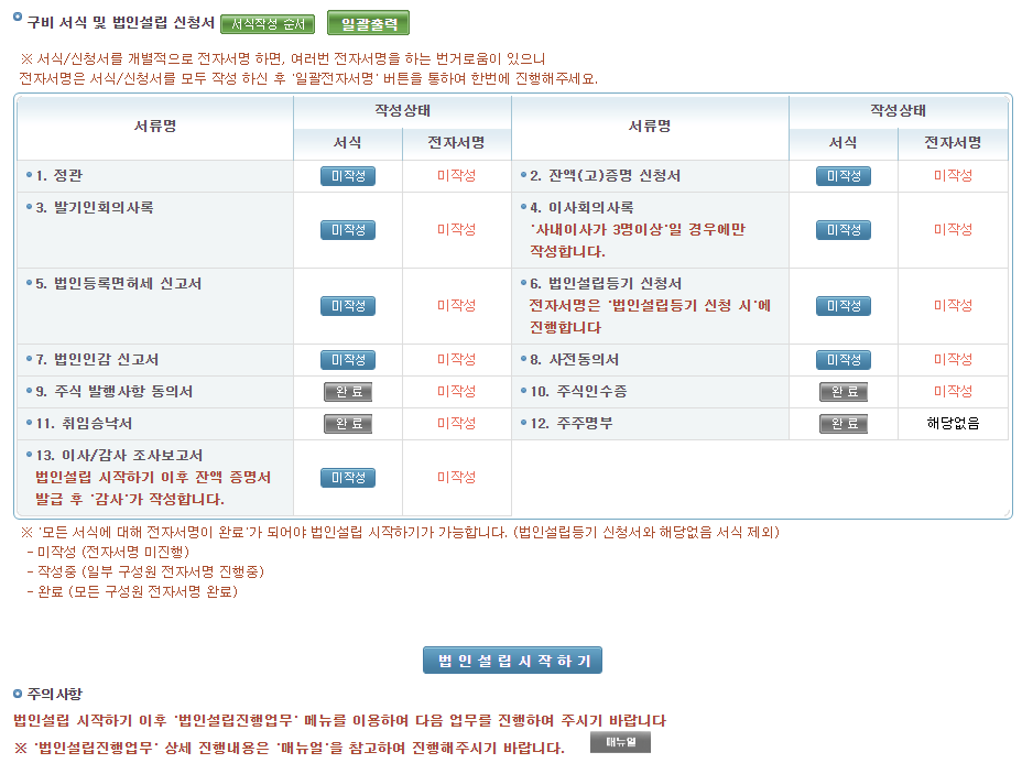 법인 설립 시 제출해야 하는 다음 관련 제출 서식들은 작성과 함께 전자서명이 되어야 한다. 1인 법인 설립의 경우, 대표이사(사내이사)와 감사가 필수적으로 관련 구성원으로 등재되어야 하므로, 정관과 회의록 등 자료 작성을 마친 후 대표이사와 감사의 개인 공인인증서로 로그인 후 전자서명을 함께 진행해야 한다.
