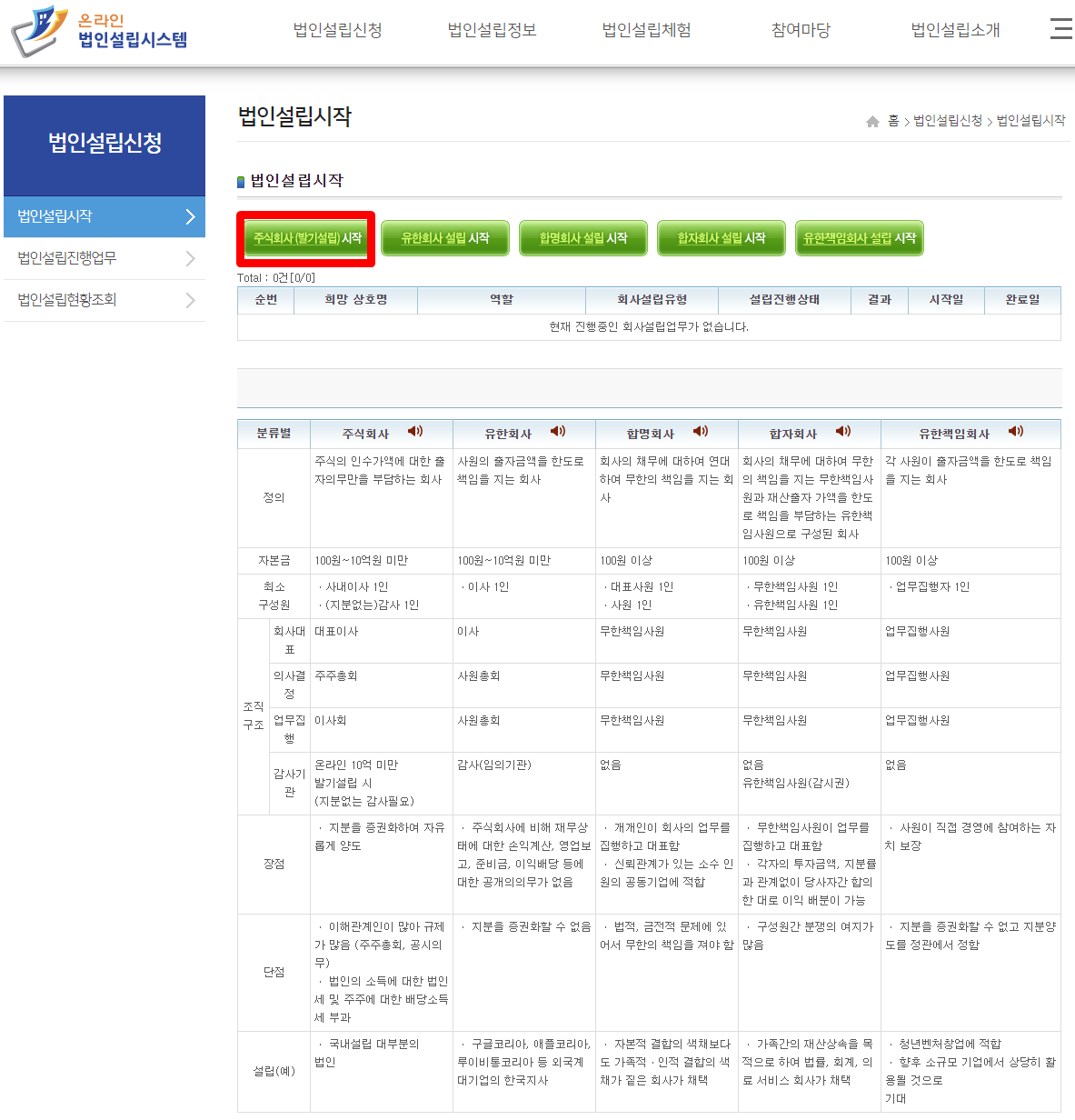 스타트비즈에 회원 가입을 했다면, 법인설립신청에서 법인설립시작을 선택하여 법인 설립을 시작해 보도록 하자. 우리가 선택할 것은 주식회사(발기설립)에 해당하며, 법인설립시작 후 주식회사(발기설립)을 클릭하여 다음 과정으로 넘어가자.