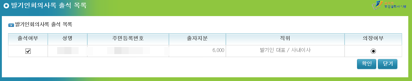 발기인회의사록도 작성하자. 먼저 위 화면에서와 같이 발기인회의 출석여부와 인적사항, 출자지분 등에 대해 살펴본 후 확인 버튼만 선택하면 발기인회의사록 작성이 시작된다. 다음 화면과 같이 개최 시간과 폐회 선언 시간 등을 입력하면, 발기인회의사록에 필요한 나머지 내용들은 자동으로 입력되게 된다.