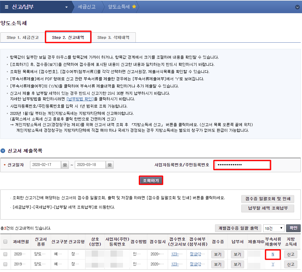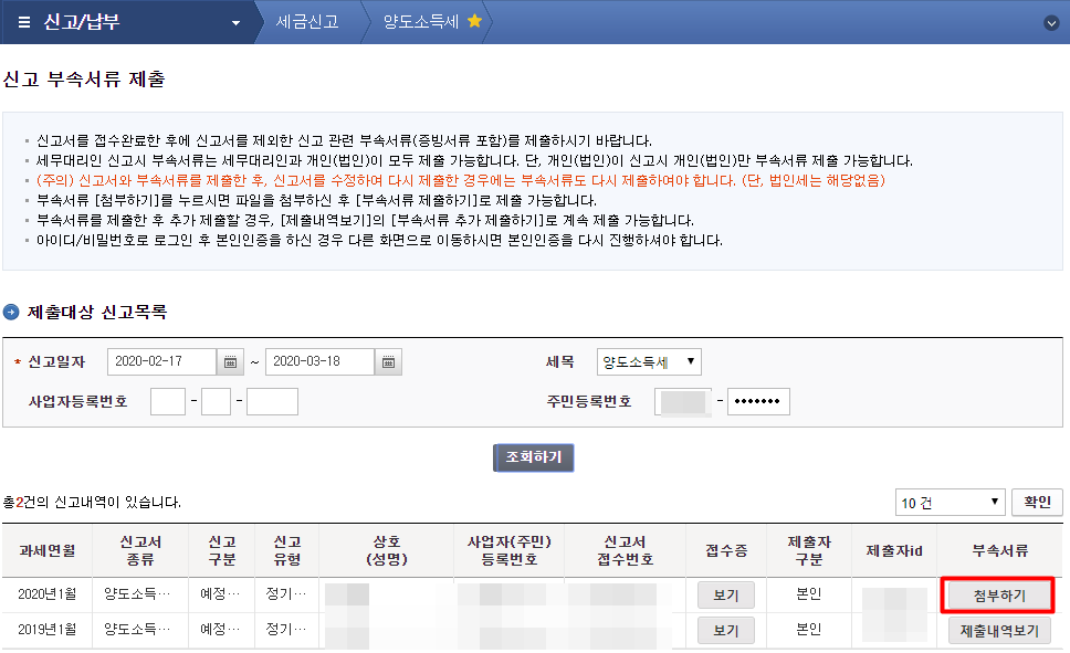 양도소득세 증빙서류 제출은 양도소득세 ▶ Step 2. 신고내역 에서 조회할 수 있다. 신고한 내역을 조회한 후 화면 우측 하단의 부속서류 제출여부를 선택한 후 부속서류를 첨부해 제출하면 최종적으로 모든 양도소득세 신고가 종료된 것이다.