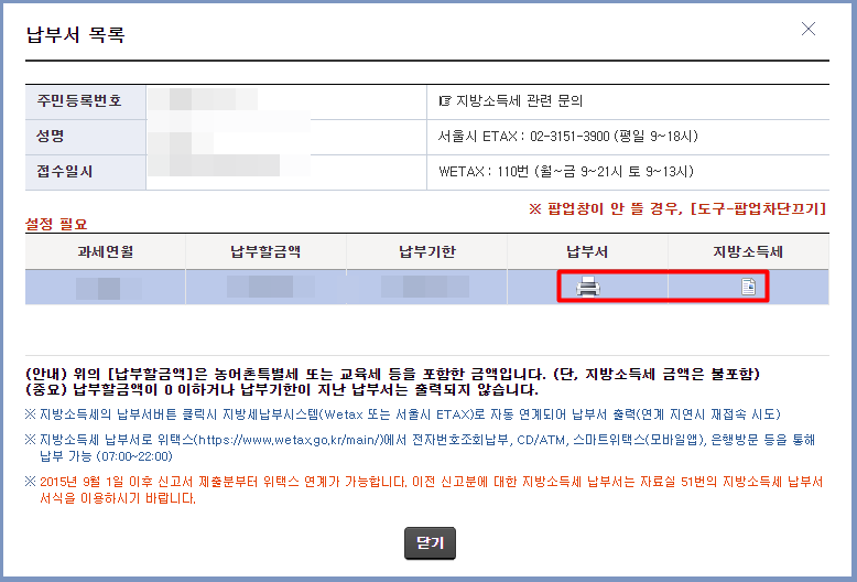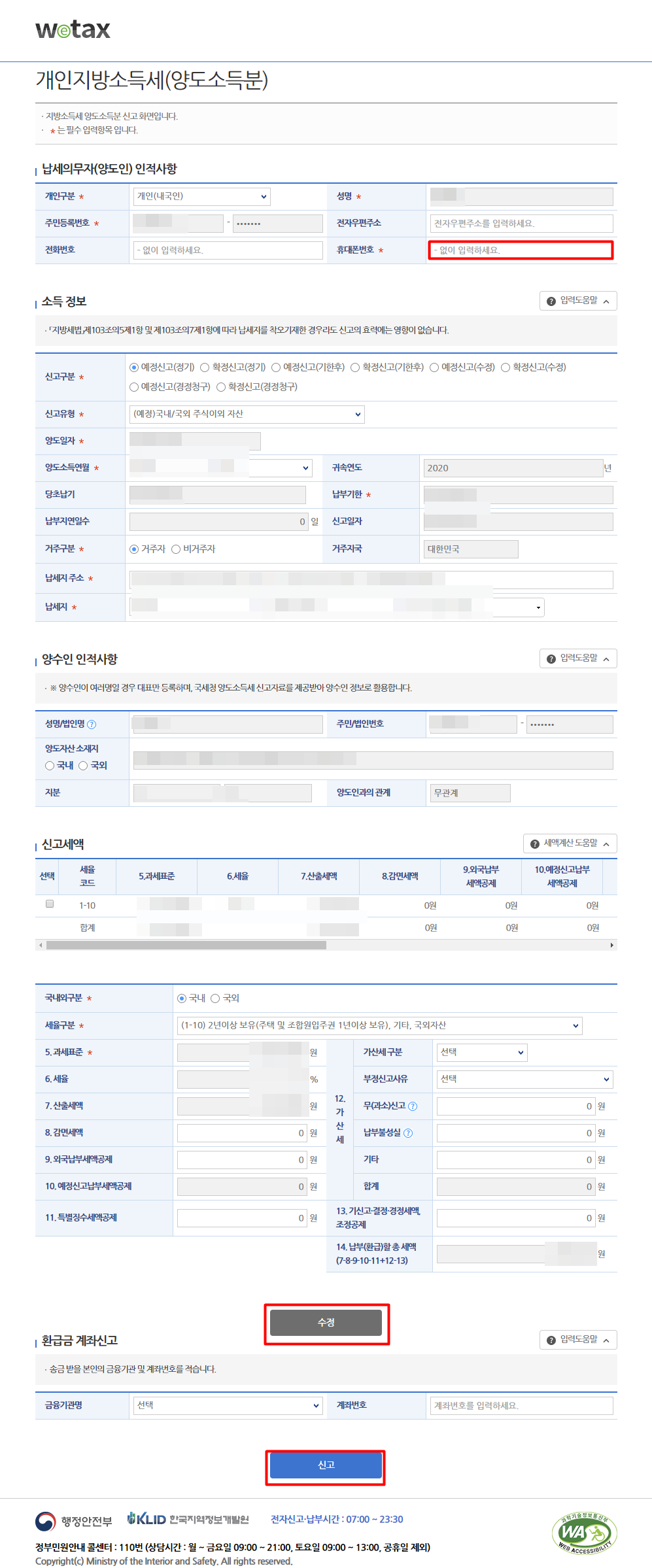 지방소득세 양도소득분 신고는 산출된 양도세(국세)에 기반하여 신고되므로 기존에 입력한 양도소득세 산출 내역을 토대로 자동으로 개인 지방소득세(양도소득분)가 산출되어 있는 것을 확인할 수 있다. 따라서, 생략된 개인정보만 입력하고 수정과 신고 버튼만 선택해 주면 지방소득세 신고가 마무리된다. 지역에 따라 서울시는 ETAX, 서울시 외의 경우는 Wetax에서 지방소득세 납부를 진행할 수 있다.