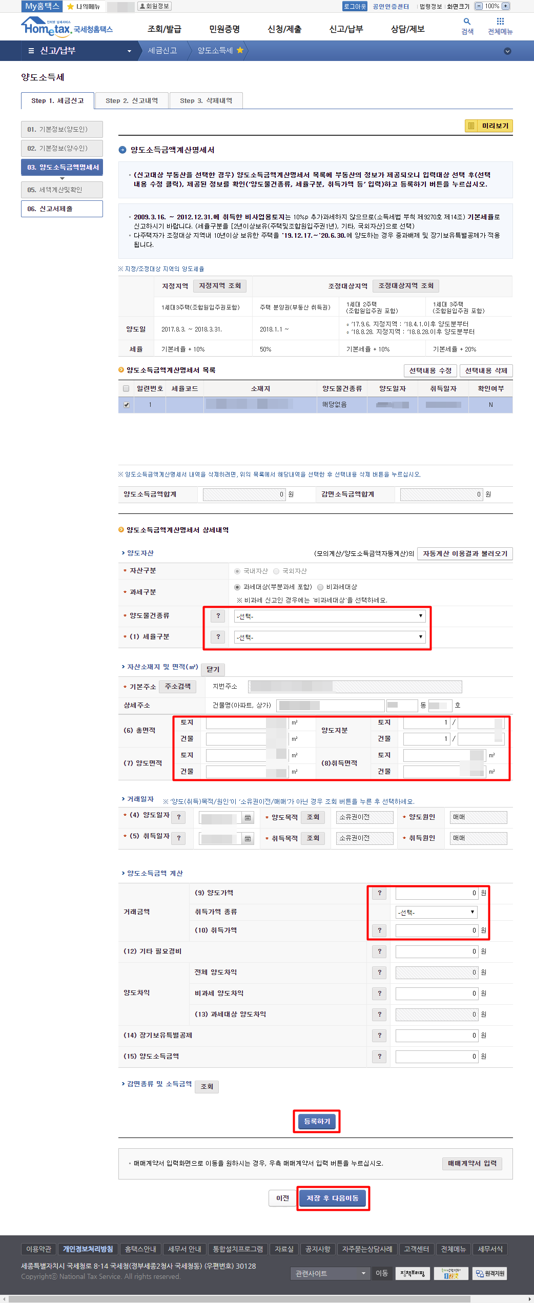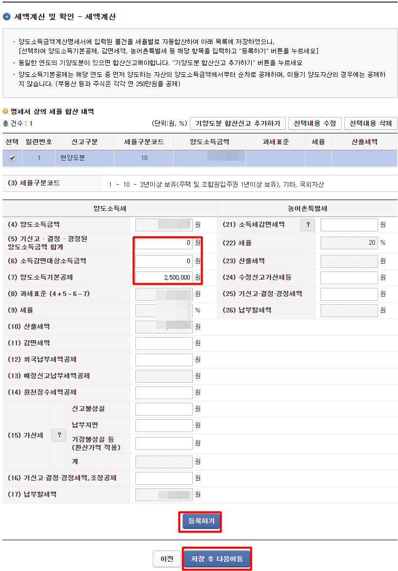 따라서, 동일한 연도에 1건의 부동산 양도세 신고 내역만 있다면 해당 내용은 입력하지 않는다. 또한, 양도소득기본공제의 경우 연간 1인 250만원까지 부동산 양도시 기본공제를 해주는 내용으로 기본공제 금액인 250만원을 해당 내용에 입력해 주면 된다. 차례대로 입력했다면 등록하기와 저장 후 다음이동 을 클릭한다.