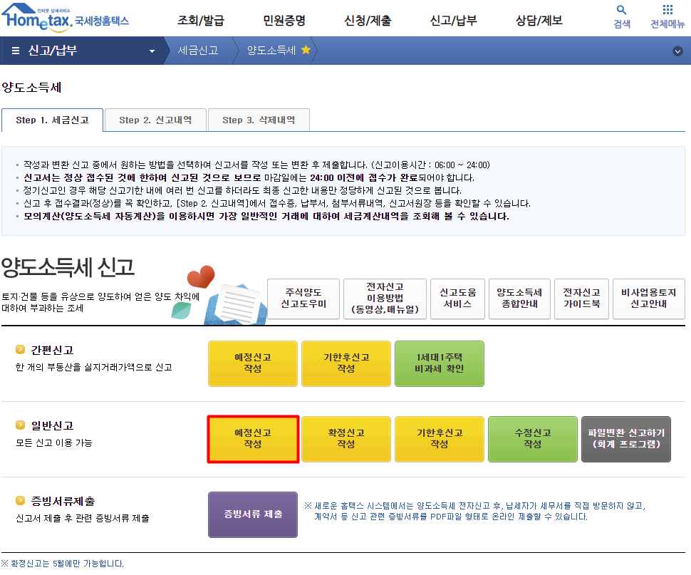 먼저 국세청 홈택스 상단 메뉴에서 신고/납부 ▶ 세금신고 ▶ 양도소득세 를 선택한다. 양도소득세 신고 화면에서는 일반신고 ▶ 예정신고 작성을 선택한다. 하나의 부동산 양도 시 양도소득세 신고 방법으로는 간편신고(예정신고 작성)을 선택할 수도 있지만, 최소 2개 이상의 양도세 신고의 건이나 모든 신고방법으로 이용 가능한 일반신고(예정신고 작성)을 선택하는 것이 좋다.