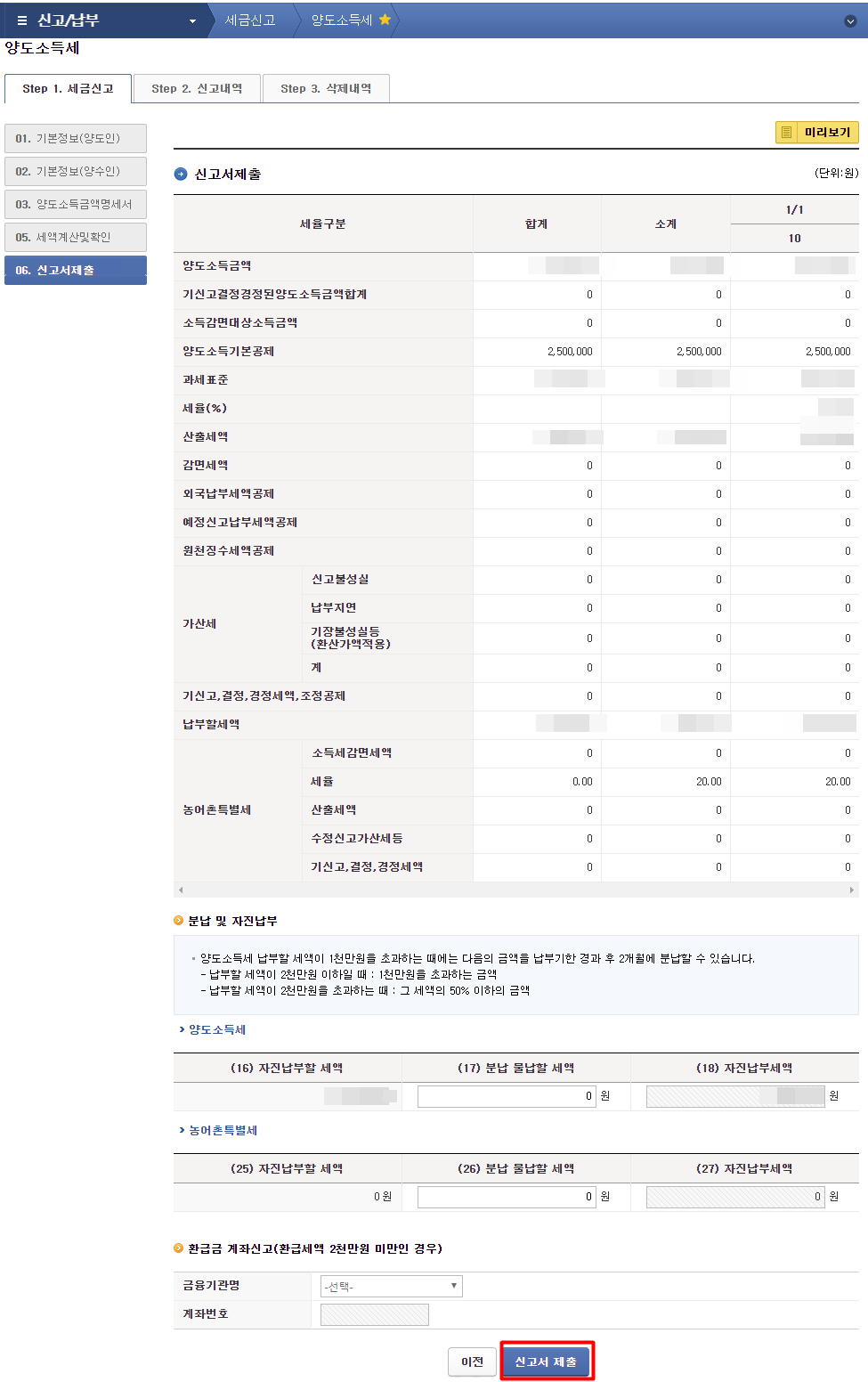 이제 최종적으로 산출된 양도소득세 신고서를 제출하는 화면이다. 해당 내용이 맞는지 다시 한번 확인 후 신고서 제출을 선택하면 양도세 신고가 마무리된다.