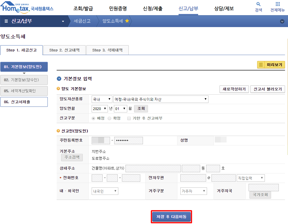 이제 본격적으로 양도소득세 신고를 시작하는 화면이다. 먼저 양도소득세 기본정보를 입력한다. 기본정보에는 양도소득세 양도인과 양수인을 입력하게 되며, 부동산 기본정보와 양도인(부동산 매도자 본인)의 인적사항을 입력한다. 위 화면에는 제시되어 있지 않지만, 부동산을 양도한 후 약 1~2개월이 지난 후에 양도소득세를 신고하는 경우라면 화면 우측 하단에서 신고대상 부동산 확인하기 를 선택할 수 있다. 이 경우, 해당 부동산 매매와 관련한 자산 내역과 기본 인적사항이 자동으로 포함되어 있으므로 양도소득세 신고가 보다 간편해진다.