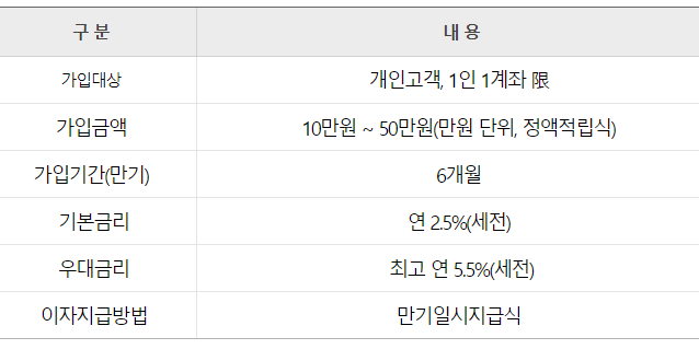우리종금 더드림정기적금 가입 가능 금액은 월 10만원~50만원까지로 납입 가능한 금액 한도는 여타 금융기관 특판 적금보다 높은 최대 50만원까지 가능합니다. 다만, 가입기간(만기)가 1년 이상이 아닌 6개월로 다소 짧은 편입니다. 하지만, 6개월 가량 매월 50만원씩 예금을 일시적으로 예치해 두어야 하는 상황라면 기본금리도 2.5%를 제공하며, 우대금리까지 포함할 경우 8%의 이자율을 제공하므로 비교 가능한 상품이 없을 정도로 높은 금리를 제공한다는 것이 장점입니다.