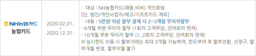 NH 농협카드는 '20년 한 해동안 5만원 이상 지방세 할부 결제 시 2~3개월 신용카드 무이자할부를 지원('20.2.1~'20.12.31)하고 있습니다. 6개월 부분 무이자할부와 10개월 부분 무이자 할부 이벤트도 진행하고 있습니다. 6개월 부분 무이자의 경우 1회차 소비자 부담이며, 10개월 부분 무이자 할부의 경우 1~2회차 할부수수료는 NH카드 소비자 부담입니다. NH카드의 경우, 2020년 년 전 기간 동안 지방세 납부 시 할부수수료를 전액 지원하고 있는 유일한 카드입니다.