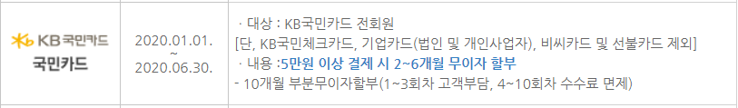 KB국민카드는 '20년 상반기 지방세 납부 시 최대 6개월의 무이자 할부를 지원합니다. 지방세 신용카드 무이자 할부 이용 시 KB카드의 6개월 무이자 할부 혜택이 가장 크다고 할 수 있습니다. 단, KB체크카드와 기업카드, 비씨카드와 선불카드는 해당 프로모션에서 제외됩니다. 10개월 부분 무이자할부도 함께 진행하며, 1~3회차 할부수수료를 KB카드 사용자가 부담하는 조건입니다.