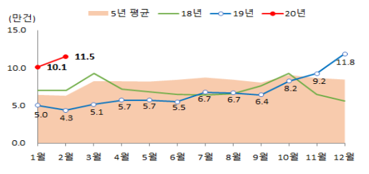 *2월 누계(만건):(’16)12.2→(’17)12.2→(’18)14.0→(’19)9.4→(’20)21.7