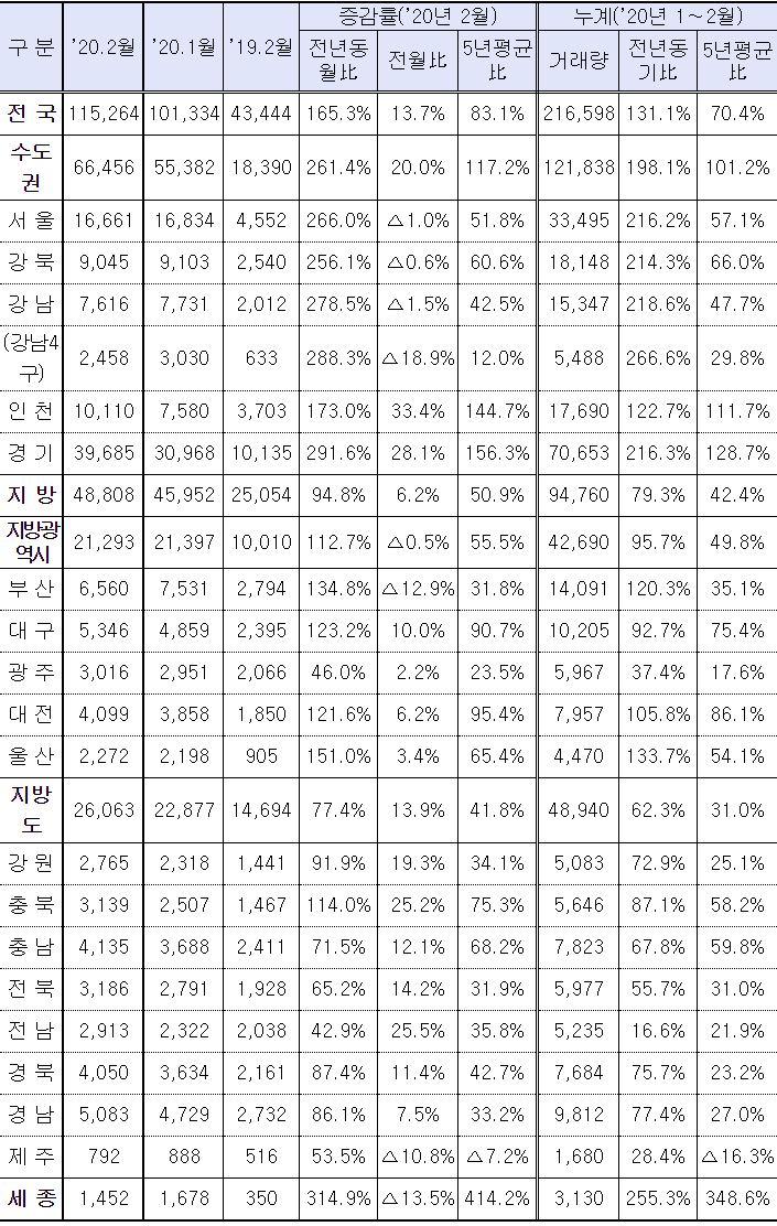 ’20.2월 누계 주택 매매거래량(216,598건)은 전년동기(93,730건) 대비 131.1%, 5년평균(127,120건) 대비 70.4% 각각 증가하였다.