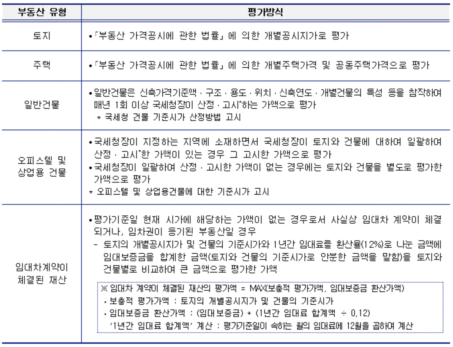 부동산에 대한 보충적 평가는 위 도표 부동산 유형에 따라 평가합니다. 다음 내용은 부동산의 시가 산정이 어려운 경우에 보충적으로 판단하는 방법에 속하며, 실지 거래가액이 있는 경우에는 해당 내용을 기준으로 하면 됩니다. 따라서, 최근 거래가 확인되지 않는 부동산 상품의 시가 판단은 다음 평가방식을 활용할 수 있으며, 일반적으로 토지와 주택의 경우 개별공시지가나 공동주택가격보다 시세가 높은 것이 일반적이므로 다음 보충적 평가 방식으로 시가 평가 시 증여세 절감의 효과가 발생하게 됩니다.