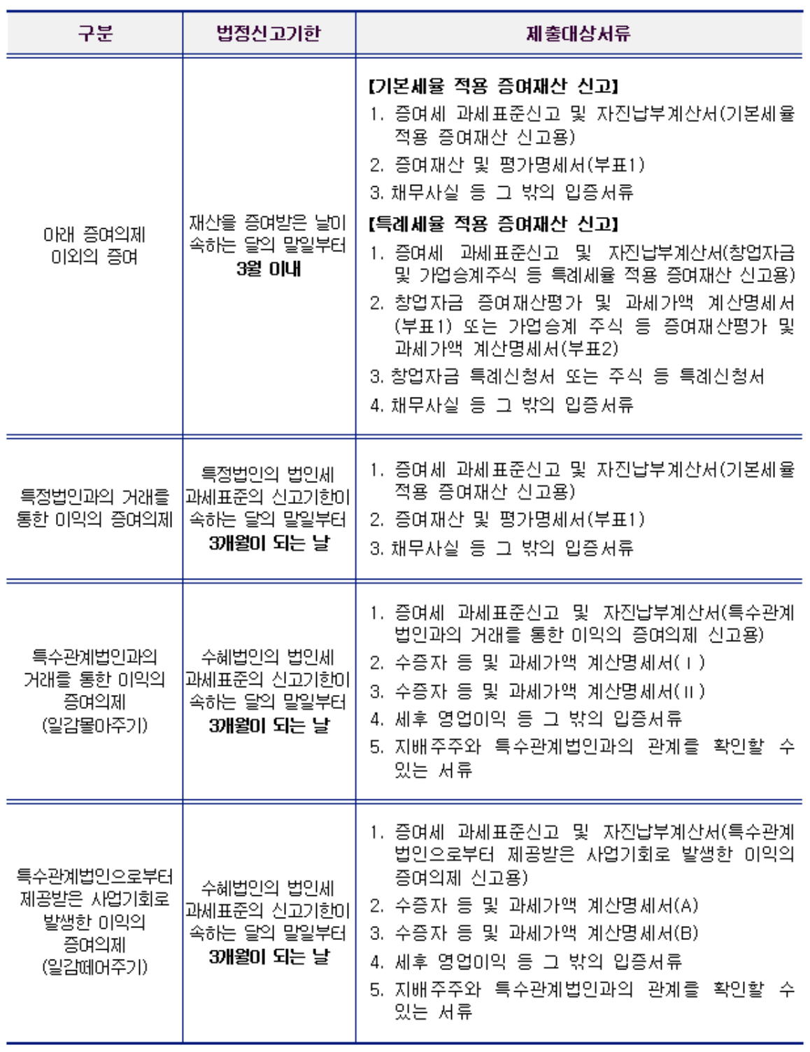 증여세는 일반적으로 재산을 증여받은 날이 속하는 달의 말일부터 3월 이내에 납부해야 합니다. 하지만 증여자와 수증자와의 특수법인 거래와 관련해 증여의제(증여로 간주)에 해당하는 증여세에 대해서는 해당 특수법인의 법인세 과세표준 신고기한이 속하는 달의 말일부터 3개월이 되는 날까지 신고·납부해야 합니다. 증여세 신고는 증여자 주소지 관할 세무서에 하면 되며, 인터넷 홈택스에서 직접 증여세 신고와 납부도 가능합니다.