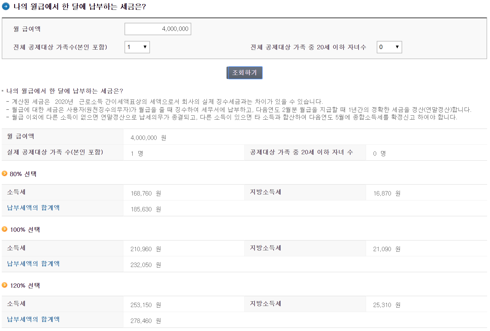 근로자는 사업주가 갑근세를 원천징수하는 경우 원천징수세액을 근로소득간이세액표에 따른 소득세액의 80%, 100%, 120% 중에서 선택할 수 있으며, 근로자의 선택에 의해 원천징수된 근로소득세는 최종적으로 근로자 연말정산을 통해 환급되거나 추가 징수됩니다. 만일, 400만원의 월급여액을 받고 있는 근로자가 본인만 공제가 가능하고, 소득세액의 원천징수 비율을 80%로 선택하였다면, 매월 근로자는 소득세로 168.760원, 지방소득세 16.870원을 원천징수해야 하며, 만일 원천징수 비율을 120%로 선택하였다면, 253,150원, 지방소득세 25,310원을 원천징수해야 합니다.