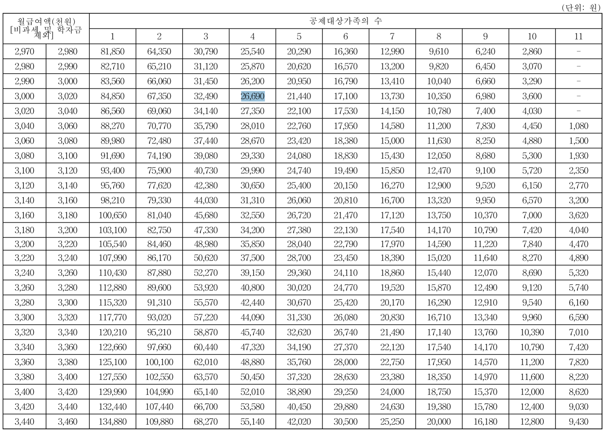 일반적으로 월급여액이 높을수록, 그리고 연말정산에서 기본공제를 받는 받은 공제대상가족 수가 많을수록 월급여액에서 근로소득세로 원천징수해야 할 금액은 상대적으로 작아지게 됩니다. 만일, 근로자의 비과세 급여와 학자금 지원금을 제외한 월급여액이 300만원이고 기본공제 대상 가족수가 4명에 해당되는 경우라면, 근로소득간이세액표(근로소득세 원천징수 조견표)를 통해 근로자의 월급여에서 원천징수해야 할 금액은 26,690원이며, 기본공제 대상 가족수가 2명이라면 원천징수해야 할 갑근세는 67,350원이 됩니다.