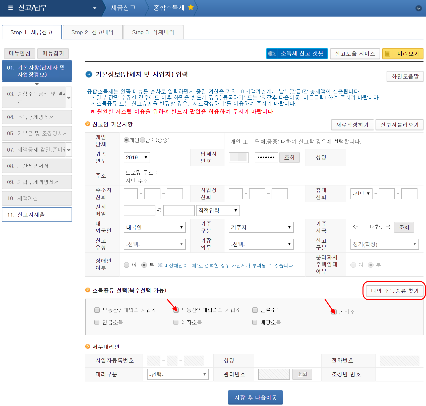 납세자 또는 사업자의 기본정보를 입력합니다. 귀속년도에 우리가 신고해야 할 종합소득세 대상이 기타소득과 부동산임대업외의 사업소득(블로그 소득)만 있는 경우를 가정하겠습니다. 만일, 근로소득과 배당소득, 연금소득, 이자소득이 있는 경우에도 기타소득의 종합소득세 신고와 크게 다르지 않으며, 다음 화면 왼쪽에 있는 세금신고 절차에 따라 순차적으로 관련 내용들을 입력해 주면 됩니다.