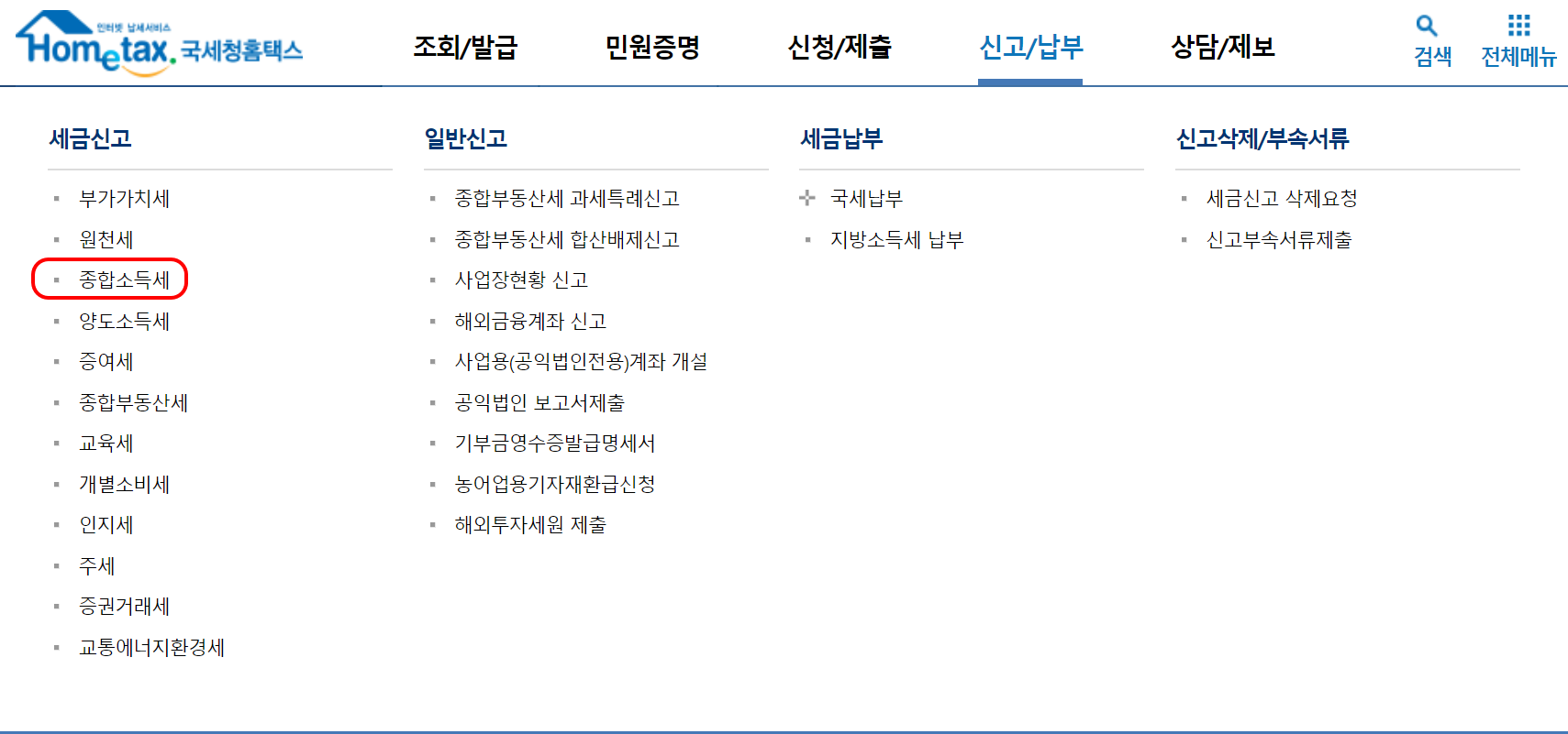 국세청 홈택스 로그인 후 신고/납부 ▶ 종합소득세 를 선택합니다.