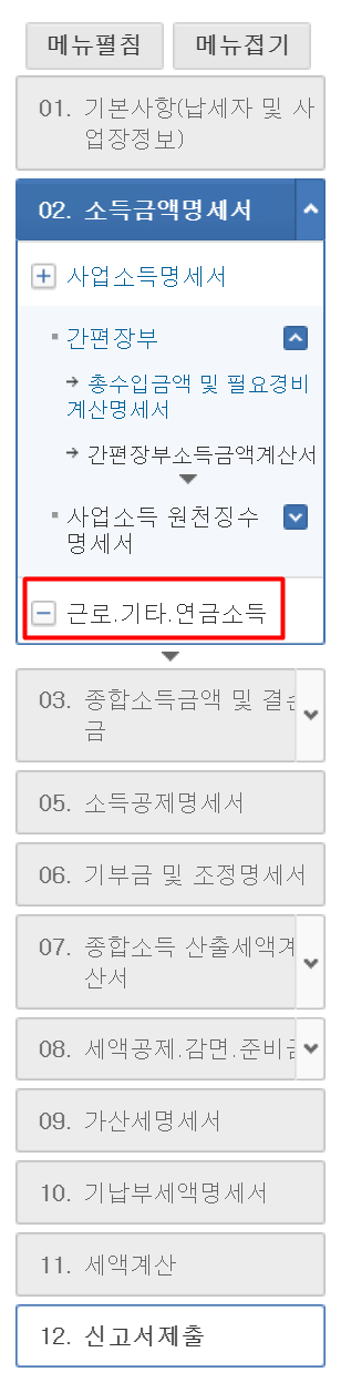 하지만, 부동산임대업외의 사업소득은 일반적으로 국내 블로그 광고 업체의 수익만 조회되며, 기타소득의 경우 02.소득금액명세서 ▶ 근로.기타.연금소득 입력 화면에서 조회가 가능합니다.