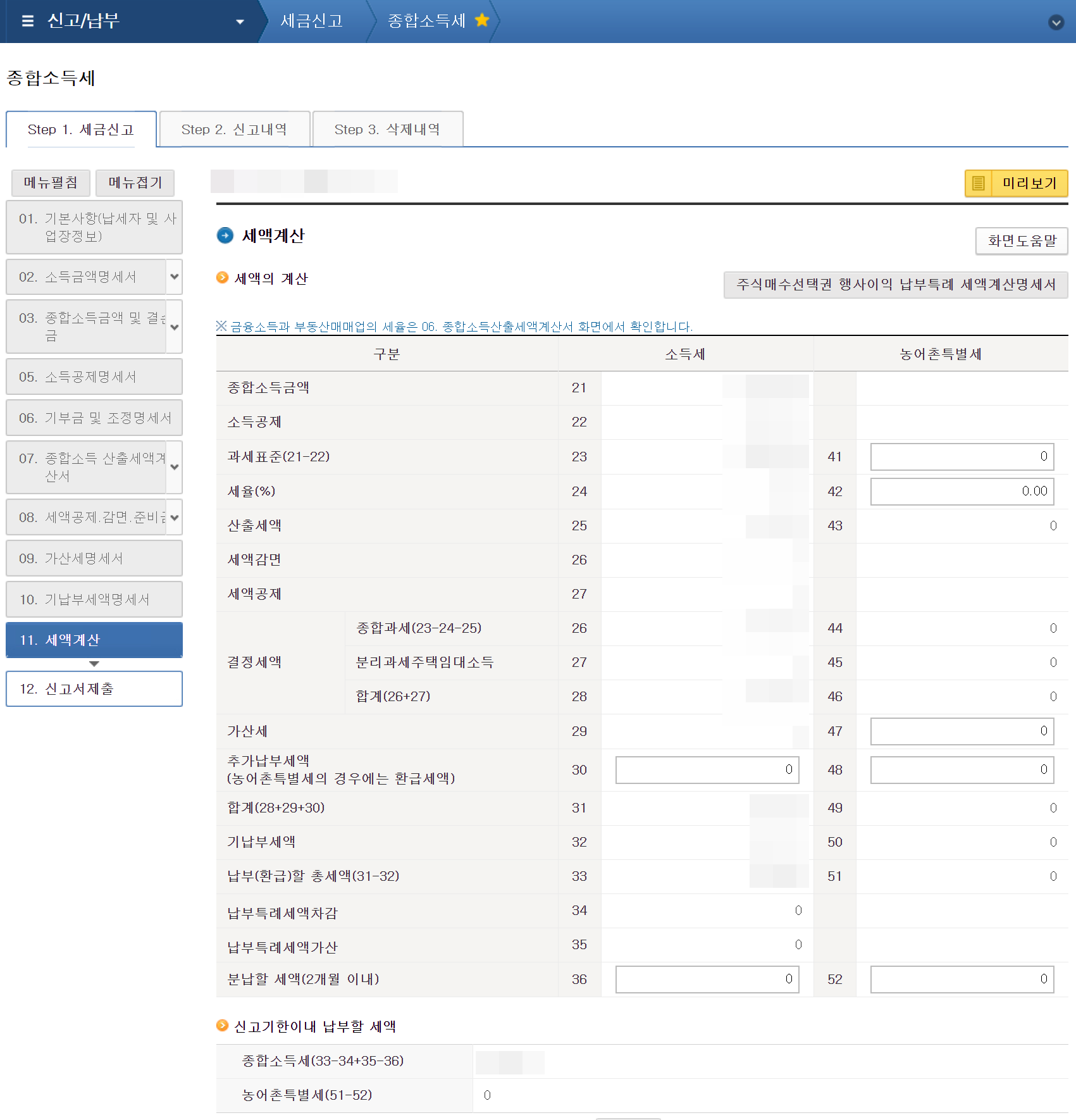 이제 세액감면 신청서와 가산세명세서 등의 내용은 해당 내용이 없기 때문에 기납부세액명세서의 원천징수 소득세의 합계 금액이 정확한지 확인 후 최종 세액계산 후 종합소득세 신고서를 제출하면 됩니다.