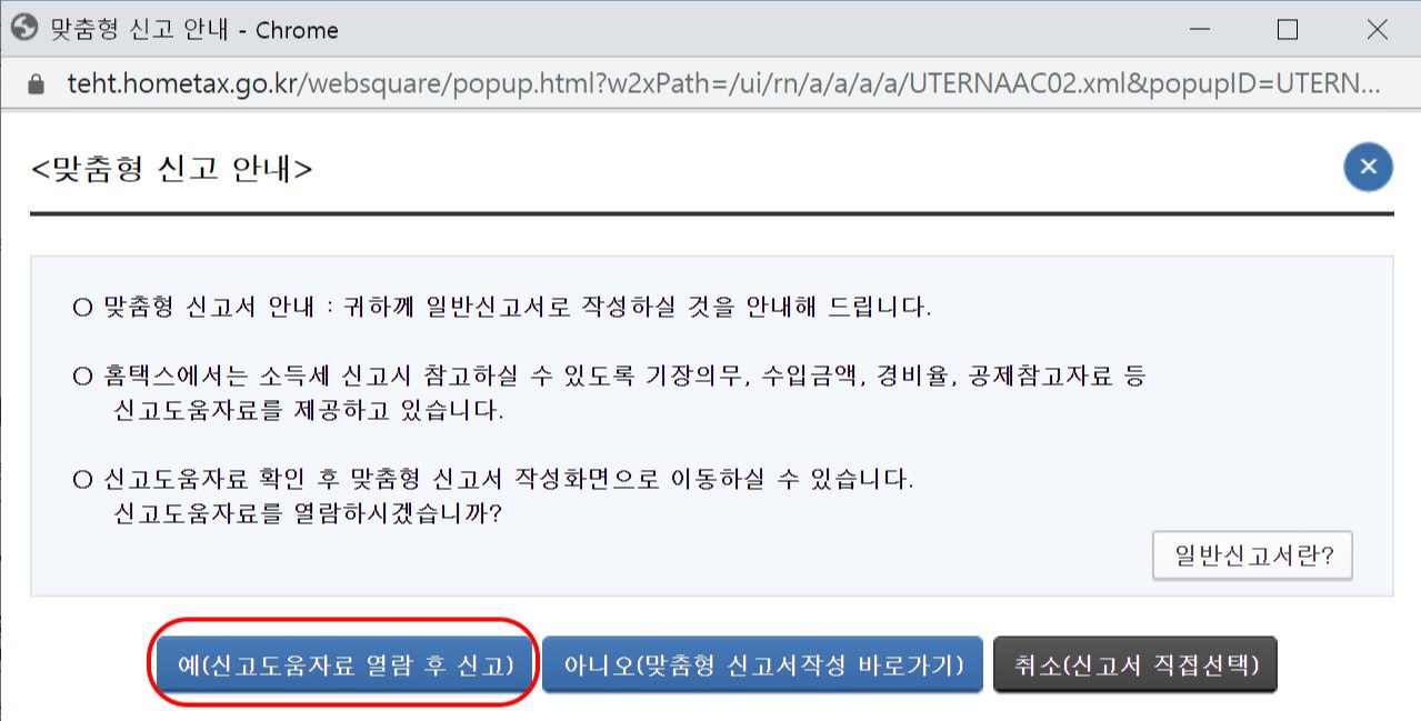 종합소득세 신고를 선택하면, 신고도움자료를 열람한 후 종합소득세 신고를 할 것인지를 물어보는 화면이 나타납니다. 예를 선택 후 신고도움자료를 열람합니다.