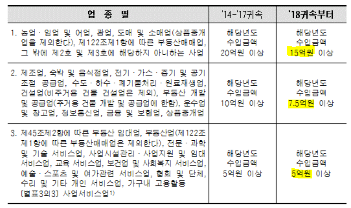 2020년 성실신고확인대상자는 '18년 귀속소득분부터 이전보다 보다 강화된 규제에 따라 해당년도 수입금액 기준이 하향 조정되었다. 해당년도(소득 귀속년도)의 수입금액을 기준으로 업종별로 성실신고확인대상자 기준이 상이하며, 해당 업종별 수입금액 기준에 따라 성실신고확인대상자가 된 경우, 필수적으로 세무대리인의 성실신고확인 과정을 거쳐 소득 신고를 해야 한다.