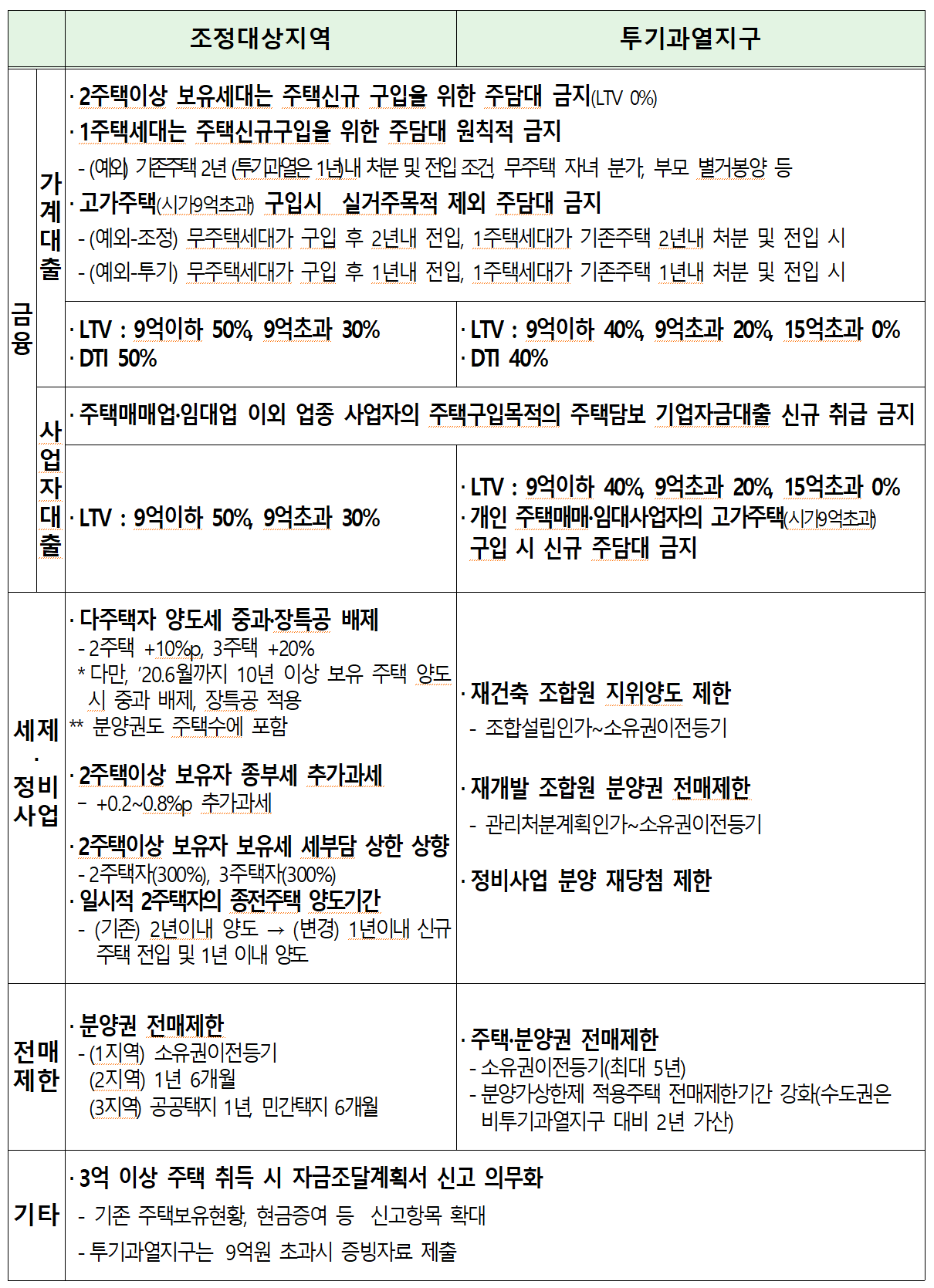 조정대상지역의 주택담보대출인정비율(LTV)은 9억원 이하 50%, 9억원 초과 30%만 가능하며, 소득대비 부채 상환비율인 DTI는 50%까지만 인정된다. 투기과열지구 LTV의 경우 9억원 이하 40%, 9억원 초과 20%, 15억원 초과 0%의 담보대출인정비율이 적용되며, DTI는 40%까지만 인정된다.