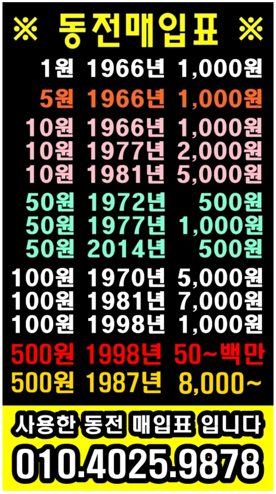 그렇다면 실제 1998년산 5백원짜리 동전을 1백만원에 매입하고 있는 곳이 있는지 확인해보자. 블로그를 통해 직접 동전을 매입하고 계신 '구팔오백이' 님의 동전매입표 이다. 구팔오백이 님의 광고를 허락없이 가져온 만큼, 독자들께 무료로 광고해 드리고자 휴대폰번호까지 삽입한 내용을 그대로 보여드리고자 한다. 다음 사진 하단의 1998년 5백원 주화의 매입 가격은 50만원에서 100만원 수준이다. 미사용 동전일 경우 상태에 따라 최대 1백원까지 매입하는 것이다.