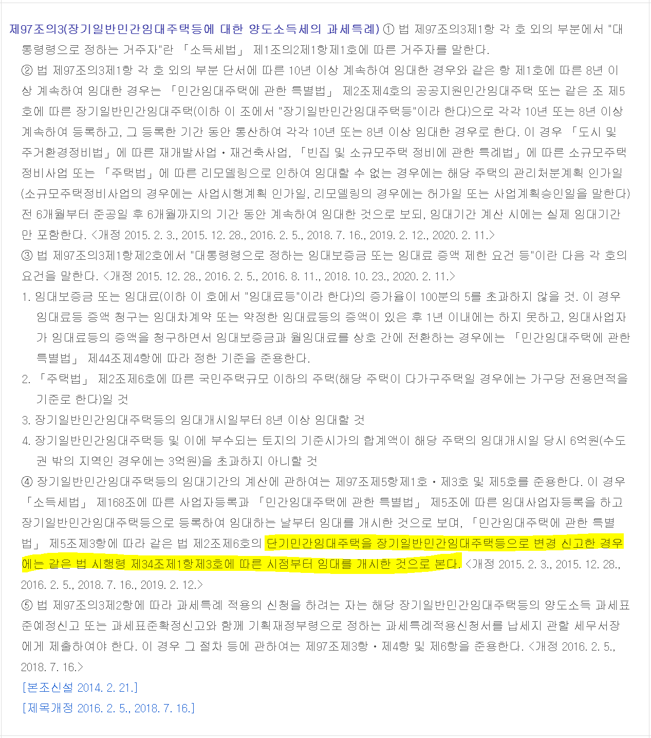 다만, 단기에서 장기로 변경 시 임대기간을 100% 인정해 주는 것은 2019.2.12 이후에 단기임대주택에서 장기임대주택으로 변경된 경우에 한합니다. 해당일 이전에 단기임대주택에서 장기임대주택으로 변경 등록되었던 경우에는 과거 누적 임대기간의 50%만 장기임대주택의 임대기간으로 인정해 주고 있습니다. 2019.2.12일이 기준일인 이유는 다음 민간임대주택에관한특별법 시행령 제97조의3(장기일반민간임대주택등에 대한 양도소득세의 과세특례)의 변경 신고에 대한 임대개시일 기산에 관한 규정 때문입니다.