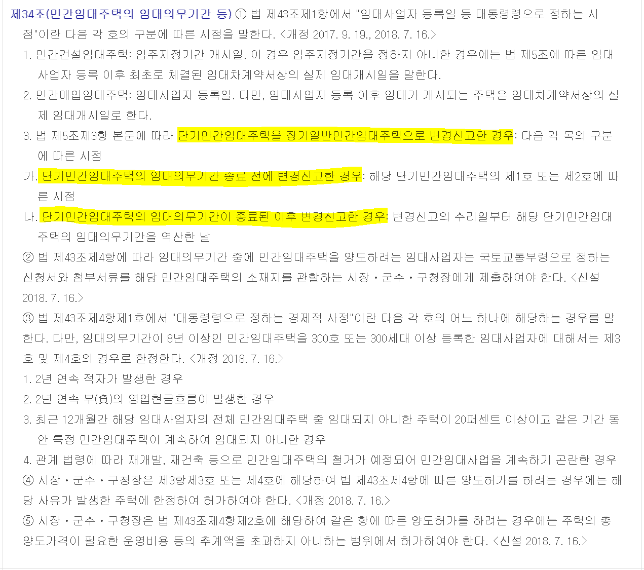 위 조특법에서 언급한 민간임대주택에관한특별법 시행령 제34조제1항제3호를 살펴보면 다음과 같습니다. 단기민간임대주택의 임대의무기간 종료 전에 변경신고한 경우에는 해당 단기민간임대주택의 제1호 또는 제2호에 따른 시점이며, 단기민간임대주택의 임대의무기간이 종료된 이후 변경신고한 경우에는 변경신고의 수리일부터 해당 단기민간임대주택의 임대의무기간을 역산한 날까지입니다. 이는 단기임대주택의 누적 임대의무기간에 대한 기준일로 위에서 살펴본 최대 4년까지 기존 임대의무기간을 인정하는 내용입니다.