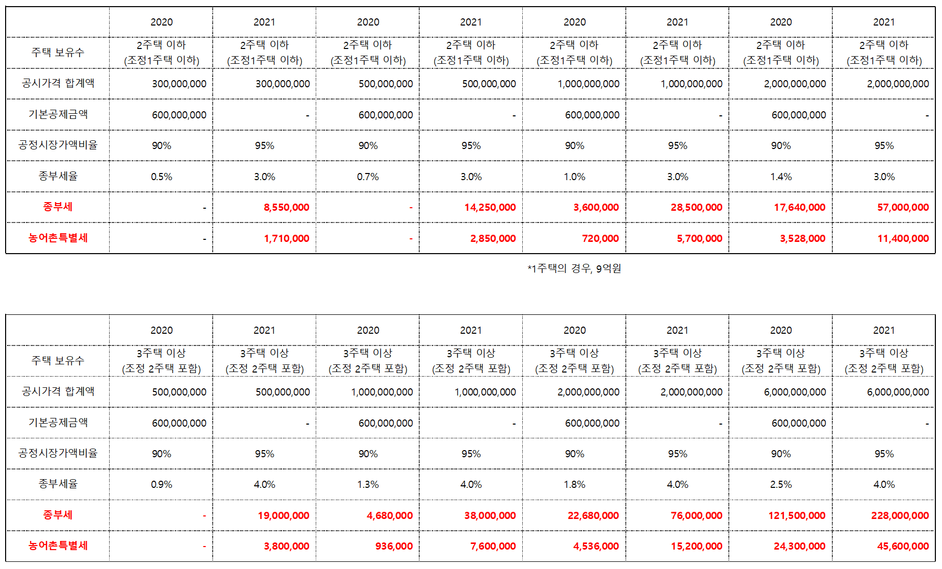 위 도표는 2020년과 2021년 주택 보유수에 따른 기본공제금액과 공정시장가액비율, 종부세율 변화를 유형에 따라 계산한 사례이다. 공정시장가액비율은 2021년의 경우 95%로 증가, 적용되며, 법인 보유주택에 대한 종부세 기본공제금액은 2021년 없다. 기본공제금액이 사라지게 되므로 법인이 주택을 보유하는 경우 전년 대비 현격하게 종부세 부과금액이 증가하게 되므로 법인으로 주택을 보유한 경우에는 매년 종부세 부담이 기하학적으로 증가하게 된다.