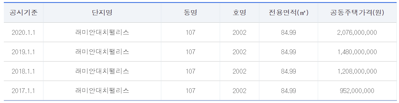 정부의 공시가격 현실화 조치에 따라, 2017.1.1 9억5,200만원에 불과했던 공동주택가격이 불과 3년만에 20억7,600만원으로 실제 거래가 수준으로 상향 조치되고 있음을 확인할 수 있다. 실거래가는 15~16억원에서 현재 29억원 선으로 2배에 못 미치는 수준으로 가격이 상승했지만, 공시가격은 2배를 뛰어넘는 수준으로 점점 실거래가에 가깝게 상향 조정되고 있음을 확인할 수 있다. 2021년의 공동주택가격은 실제 수준에 보다 근접하게 책정될 것은 분명해 보인다.