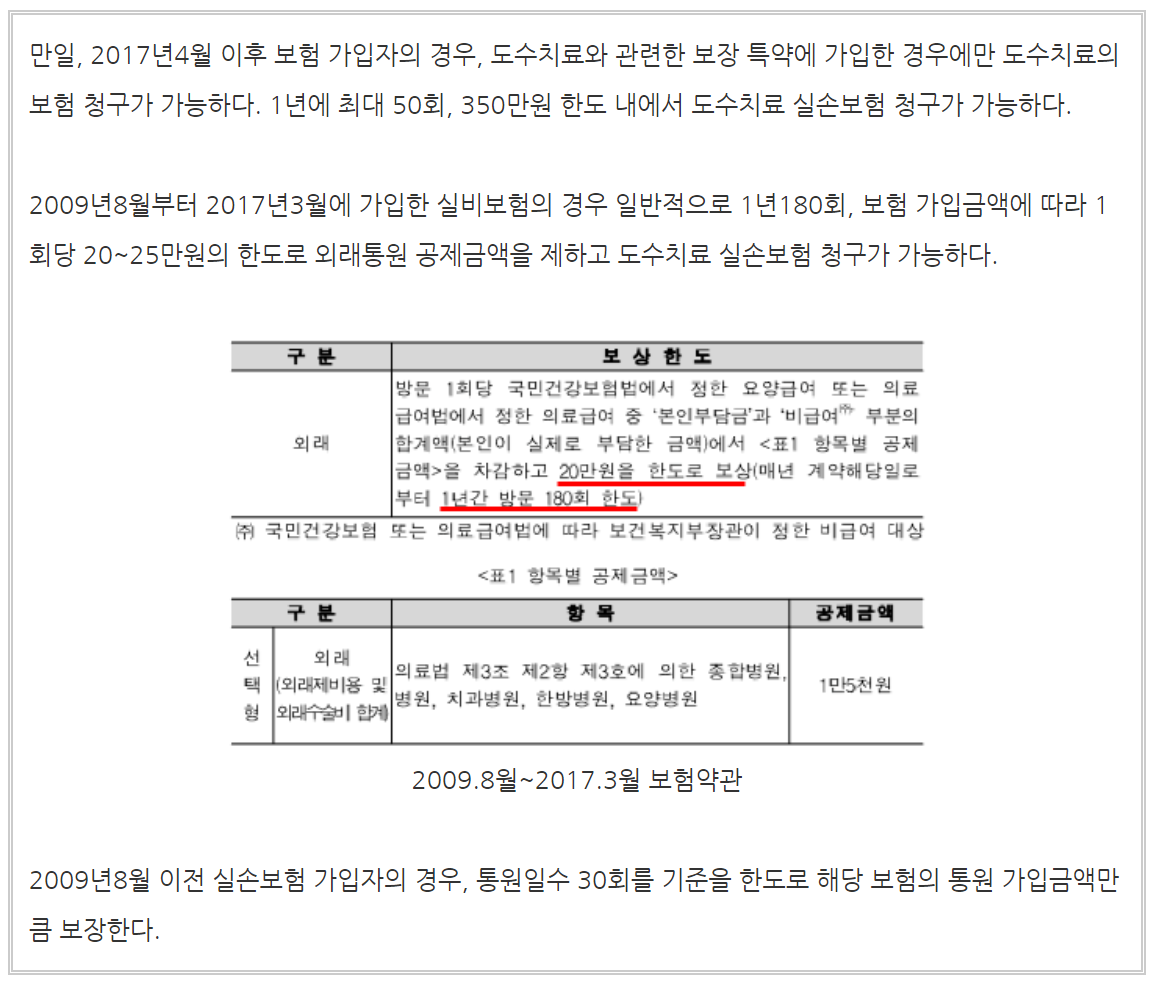 따라서, 내가 가입한 실비보험이 우선 2017.4월 이전에 가입한 실손보험인지부터 확인해야 도수치료 실비보험 청구가 가능하다고 할 수 있다. 만일, '17.4월 이전 실손보험 가입자라면, 가입한 보험사 약관에 따라 외래 통원 횟수와 보험 가입금액에 따라 도수치료 비용을 실손보험으로 처리할 수 있다.