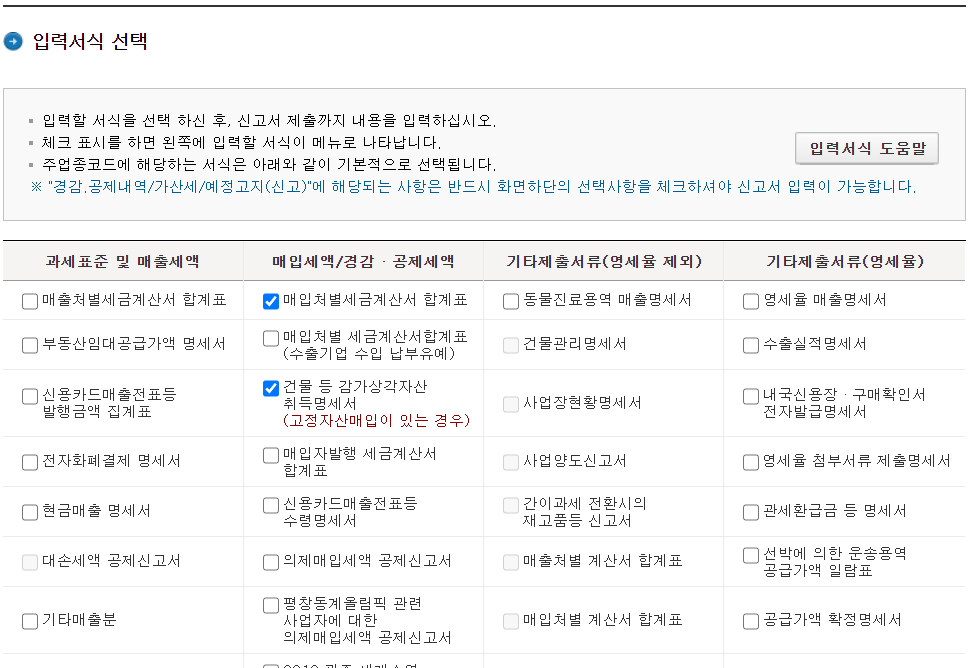 사업 초기 건물 분 부가가치세 납부분에 대한 조기환급 신청이므로, 세금계산서는 건물 매도자로부터 받아두어야 합니다. 이제 매입처별세금계산서 합계표와 건물 등 감가상각자산 취득명세서를 선택 후 저장 후 다음이동을 클릭합니다.