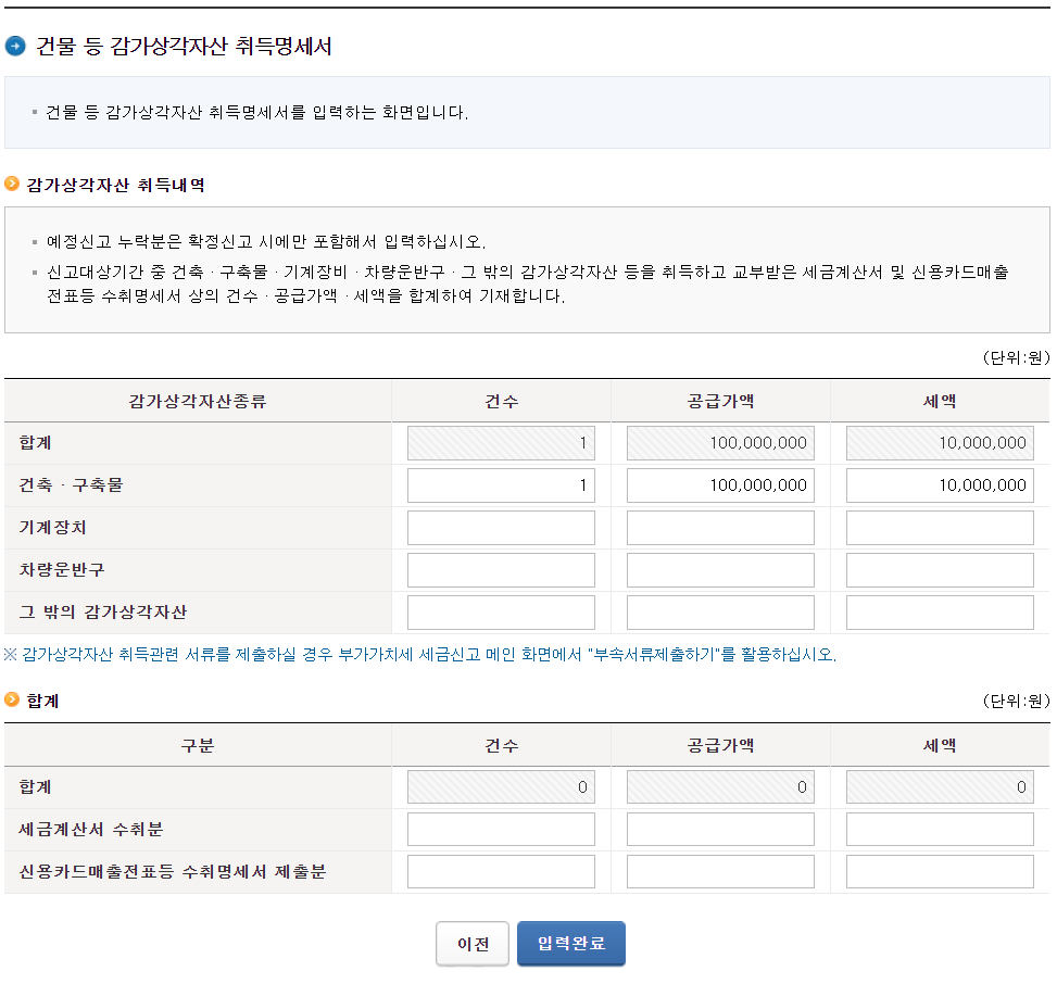 세금계산서수취분 일반매입 작성이 먼저 완료되면 이제 건물 등 감가상각자산 취득명세서 화면에서 건수와 공급가액, 세액 등을 입력합니다. 매입세금계산서와 동일한 금액으로 작성하면 됩니다.