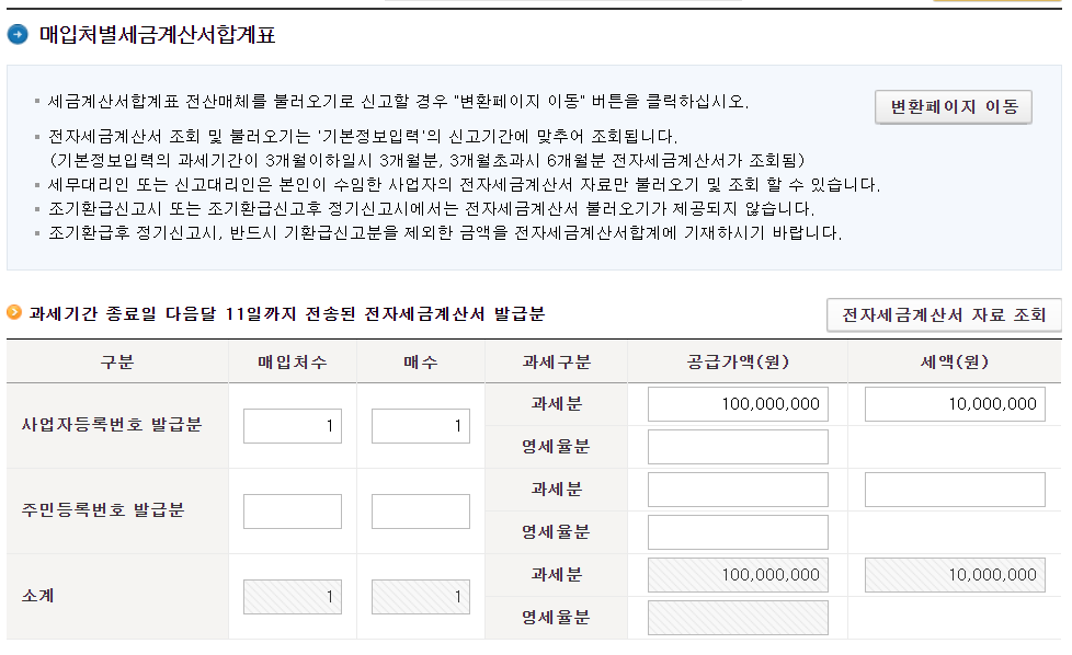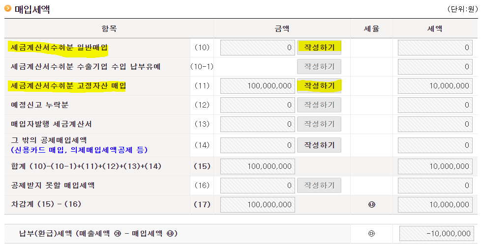 건물 등 감가상각자산 취득명세서까지 작성이 완료되면 세금계산서수취분 고정자산 매입 현황으로 금액이 이전되며, 공급가액과 세액 확인이 가능합니다. 그리고 조기 환급받을 세액도 확인이 가능합니다. 다음 사례는 예시로 1억원의 공급가액과 1천만원의 부가세를 조기 환급하는 경우로 입력한 화면입니다.