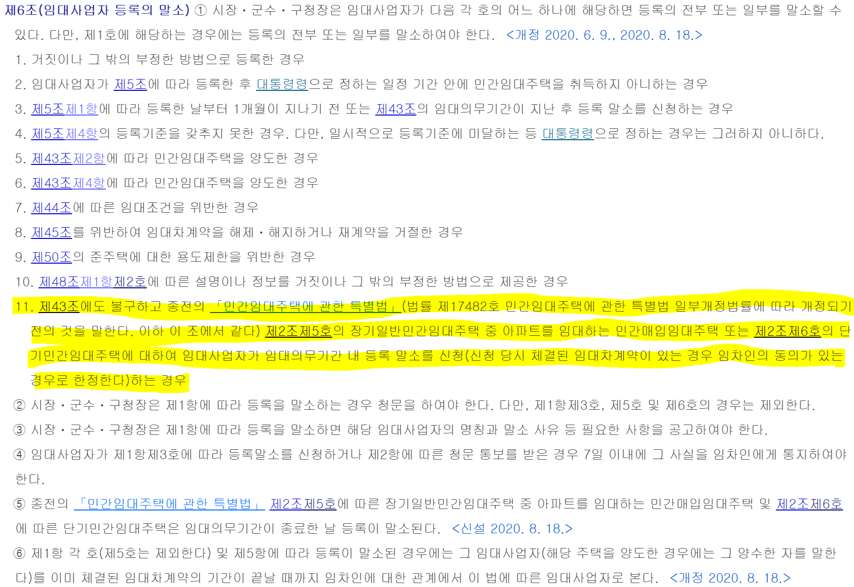 주택임대사업자 임대주택 자진 등록말소와 관련한 법령은 민간임대주택에 관한 특별법 제6조제1항제11조로 신청 당시 체결된 임대차계약이 있는 임대주택의 경우 임차인의 동의가 필요합니다.