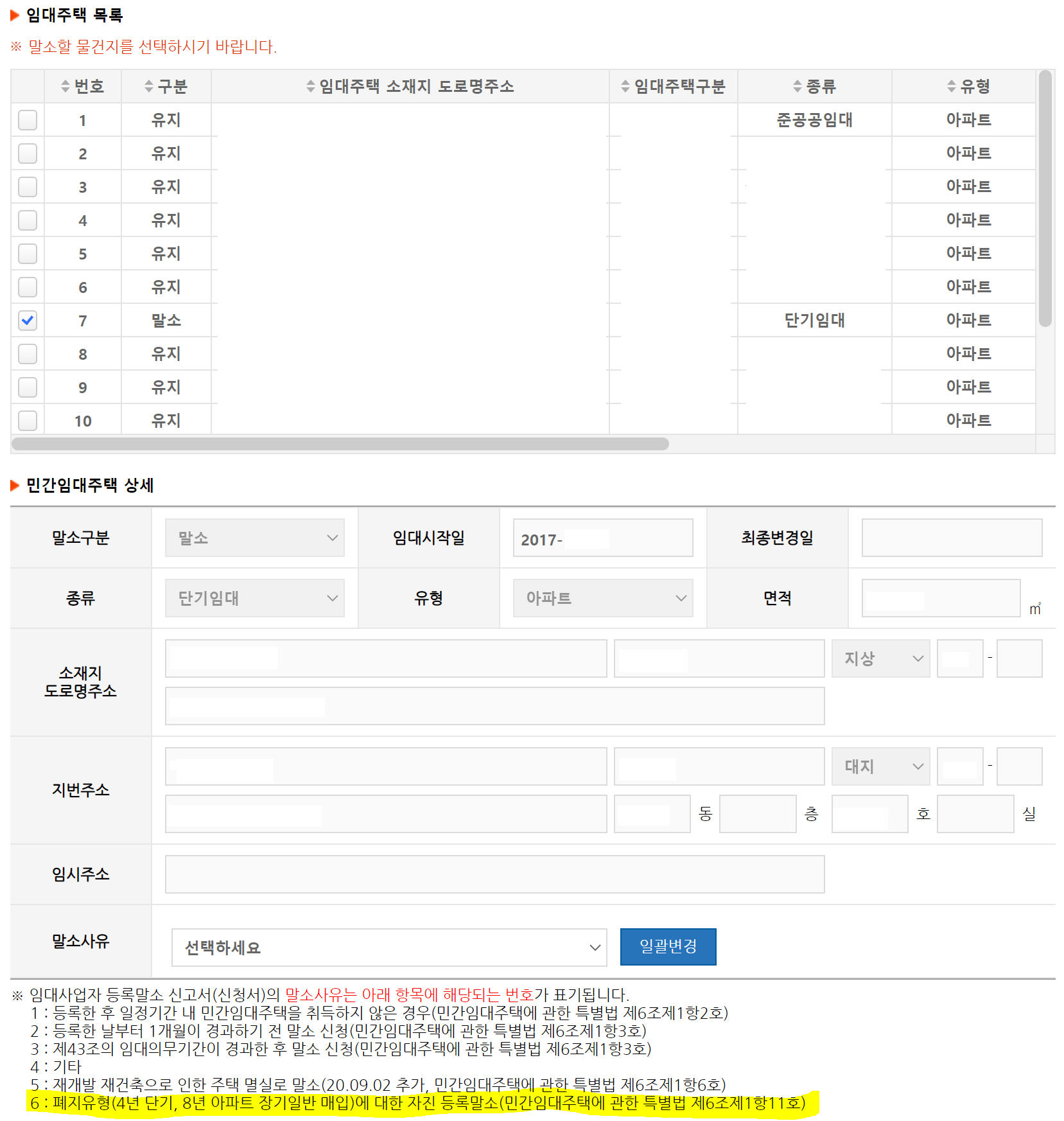 임대주택 내용 확인 후 말소사유에 폐지유형(단기, 8년 아파트 장기일반 매입)에 대한 자진 등록 말소를 선택합니다. 2020년 8월 18일 민간임대주택법 시행 이후 해당 임대주택에 대해 자진등록 말소가 가능합니다.