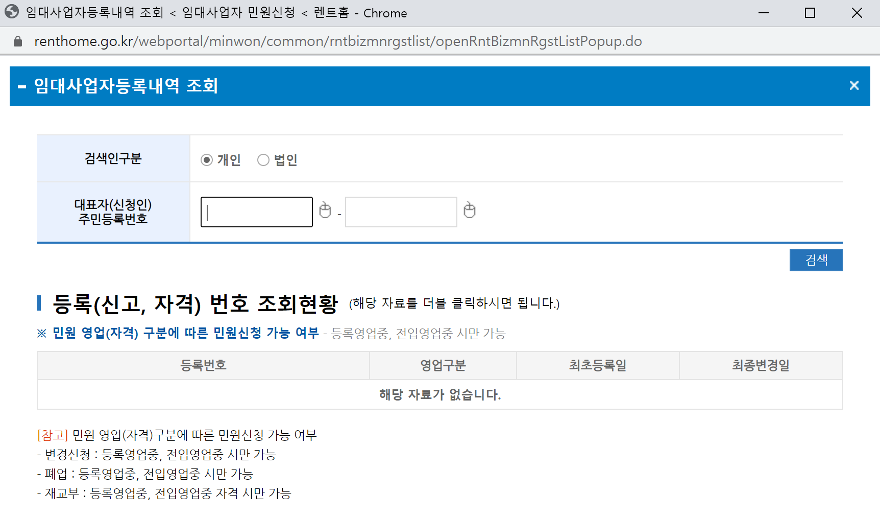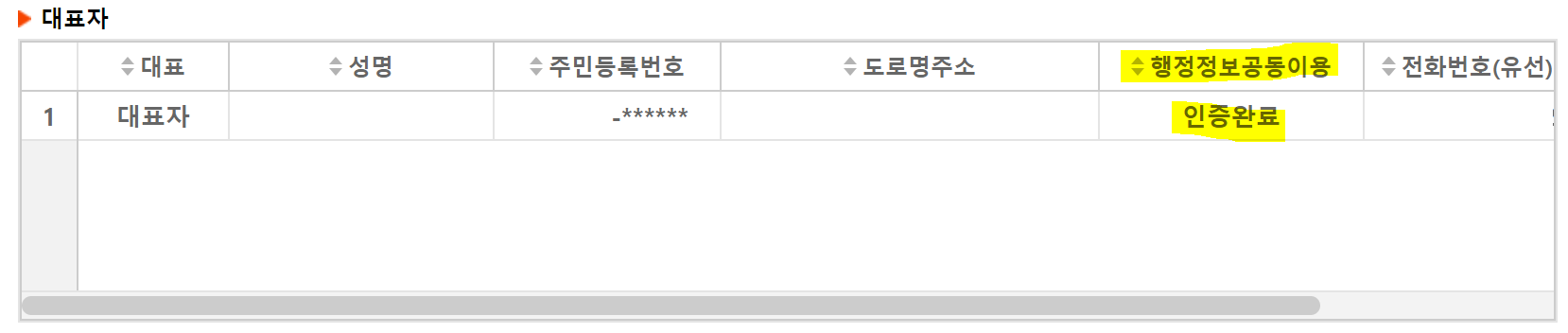 본인의 임대사업자 등록내역을 확인 후 대표자 칸의 행정정보공동이용에 공인인증서 인증을 완료합니다.