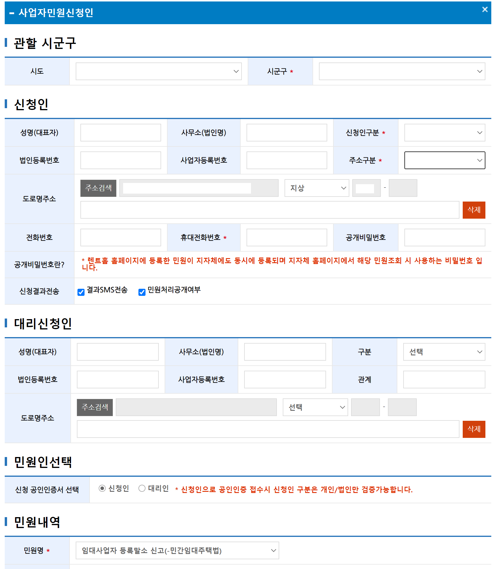 임대주택 등록 말소 관할 시군구는 임대주택을 등록한 임대사업자 거주지 관할 지자체를 선택하면 되며, 신청인 관련 사항 입력 확인 후 확인을 선택하면 임대주택 등록말소 민원 신청이 완료됩니다.