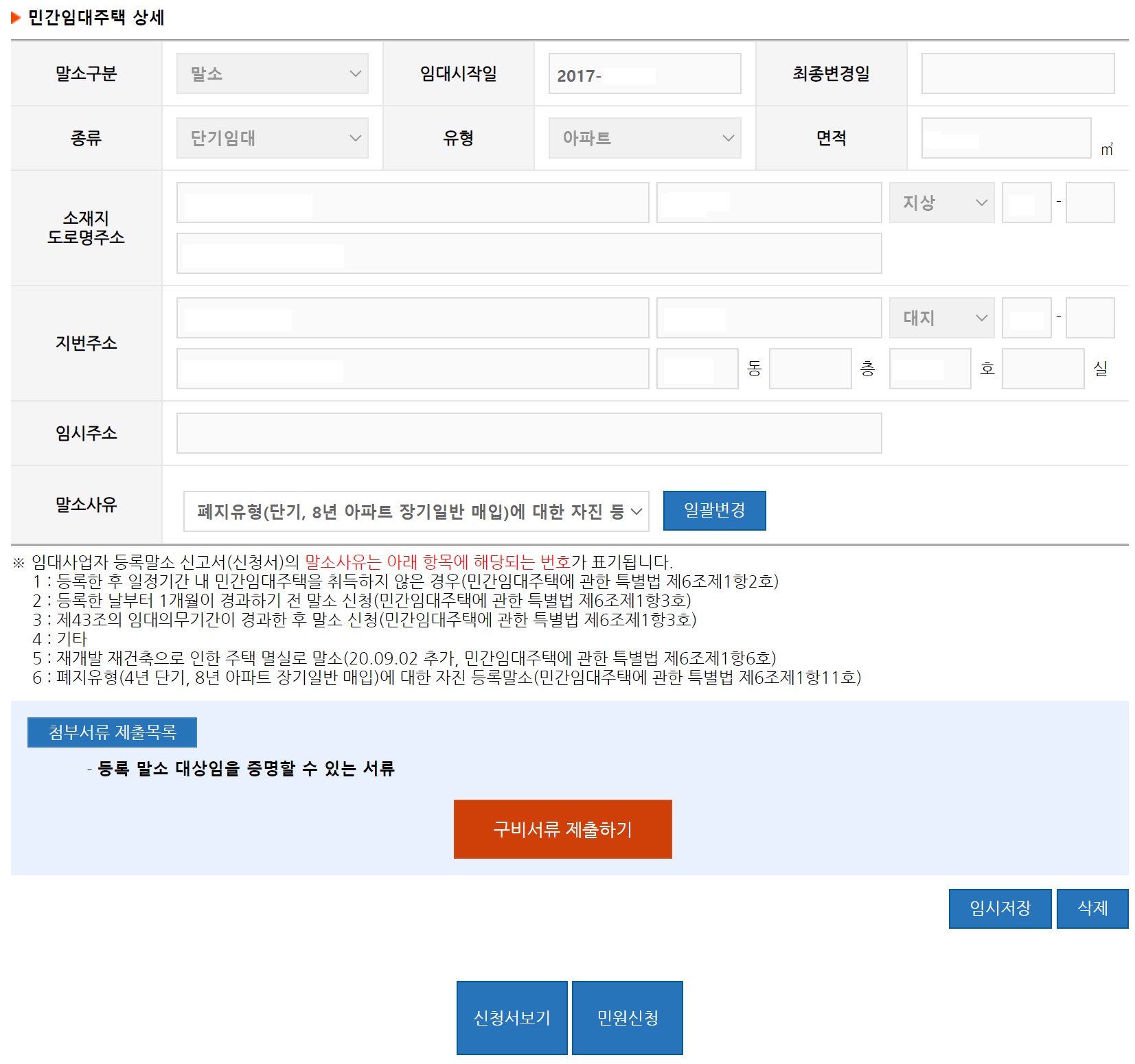 임시저장 후 구비서류 제출하기를 선택합니다. 임대주택 등록 말소를 위한 필수 구비서류는 임대사업자 자발적 말소 신청에 따른 임차인 동의서 이며, 해당 양식에 대한 임차인 서명 후 제출하면 됩니다.
