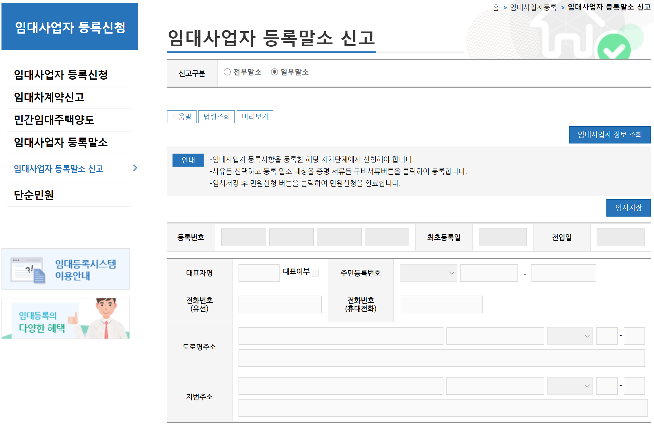 렌트홈 공인인증서 로그인 후 임대사업자 등록신청 - 임대사업자 등록말소 신고를 선택합니다. 임대주택 전부를 말소하는 경우에는 전부말소를 선택하고 일부에 대해서만 말소신청을 할 경우에는 일부말소를 선택합니다. 임대사업자 정보 조회를 클릭해 공인인증서 인증을 합니다.