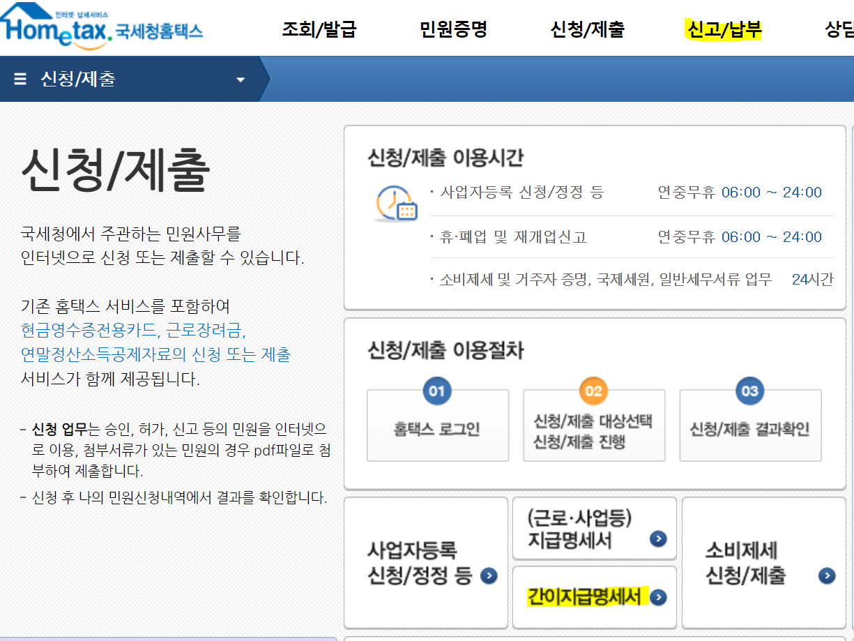 홈택스에서 간단히 신고가 가능하며, 신고/납부 > 간이지급명세서 > 간이지급명세서(근로소득) 를 선택합니다. 홈택스 직접작성제출방식 또는 회계프로그램을 사용하는 경우에는 변환제출방식을 선택하며, 직원수가 많지 않은 경우 직접작성제출방식으로 간편하게 신고가 가능합니다.