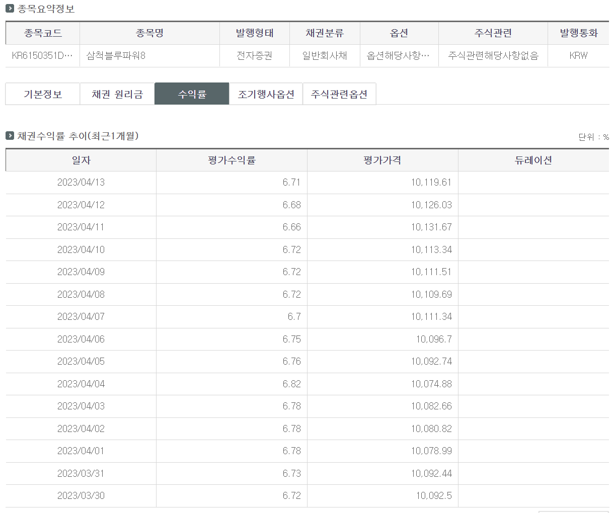 일반 회사채 채권 종목별로 자세한 발행정보와 민간평가가격(민평단가), 평가수익률(민평금리, 민평수익률)을 확인하고 싶다면 다음 KSD증권정보포털(SEIBro)에서 확인할 수 있다.