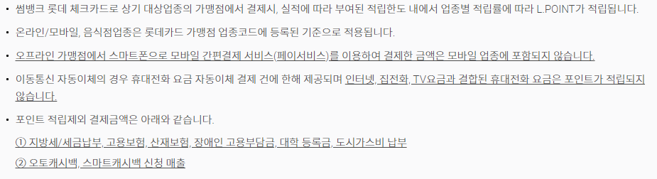 다만, 썸뱅크 롯데 체크카드의 경우, 전월 실적이 30만원 이상인 경우에 전월 실적의 3%까지만 적립이 가능하므로 만일 5월에 썸뱅크 롯데 체크카드를 신규 발급하고 60만원을 사용하였다면 18,000원의 엘포인트가 적립된다. 오프라인 가맹점에서 모바일 간편결제 서비스(삼성페이, 페이코 등)를 이용해 결제한 금액은 모바일 업종에 포함되지 않으며, 국세와 지방세 등 세금납부와 4대보험, 대학등록금, 도시가스비 납부 등의 경우에는 포인트 적립이 제외된다.